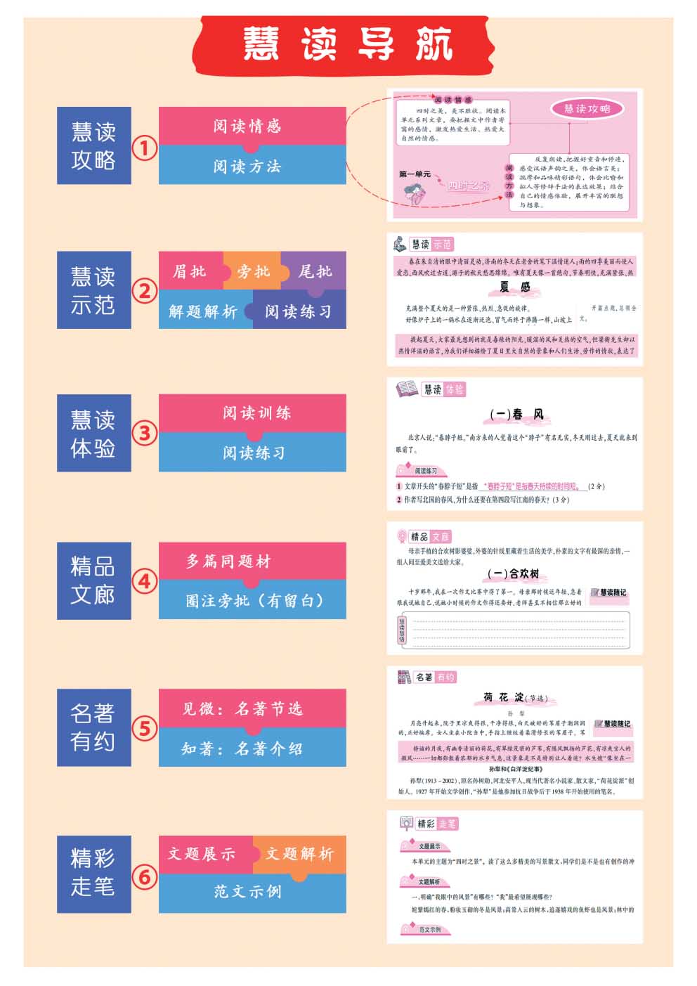 《隨堂慧讀》依靠教材的體例,首創(chuàng)“六位一體”閱讀法:①慧讀攻略→ ②慧讀示范 → ③慧讀體驗 → ④精品文廊 → ⑤名著有約 →⑥ 精彩走筆。